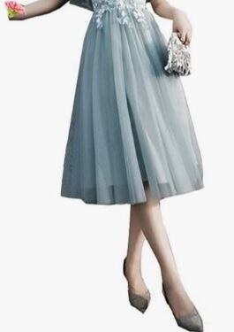 チュールひざ丈のドレス。おちついた灰青系のサテン地の上に、立体刺繍をあしらったチュールを重ねています。胸元には豪華な花びらがあしなわれ、ふんわりとしたフリルの袖が二の腕をしっかりカバーしてくれいています。ボリューム感のある豪華な印象に仕上げています。背中網掛けですので結び具合の調整でバストとウエストは+5cmまでサイズアップ可能です。結婚式、パーティ、イベントなど華やかなシーンにぴったりの一着です。背中網掛け、ウエストより下ファスナー有。裏地あり。胸パット付き。