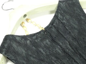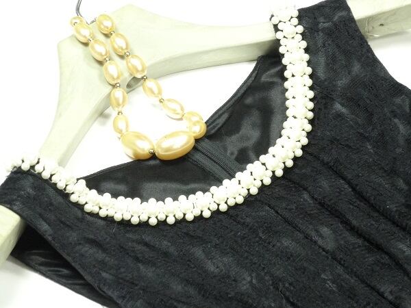 襟元ビジュー飾りのワンピ-ス。トップス部分はさらっとした網目状の生地を使用。襟元にフェイクパールをあしらい上品な印象に。スカート部分は艶やかなピンクのサテン地の上に網目状の薄いシースルーの生地を重ねています。ウエストのリボンベルトがアクセントに。ちょっとおしゃれな普段着として、またフォーマルなシーンでも活躍してくれる一着です。裏地有。背中ファスナー。ウエストリボンベルトは取り外し不可。