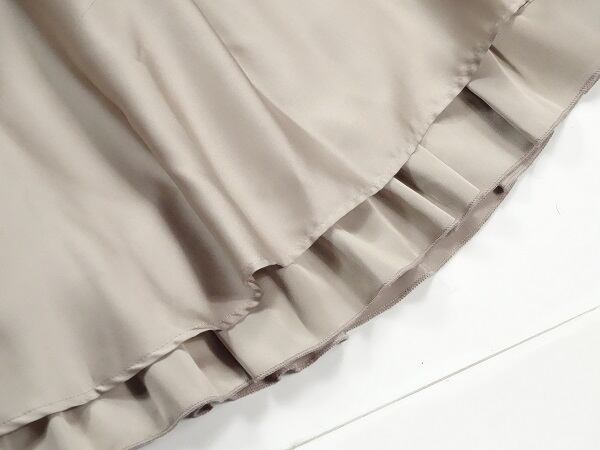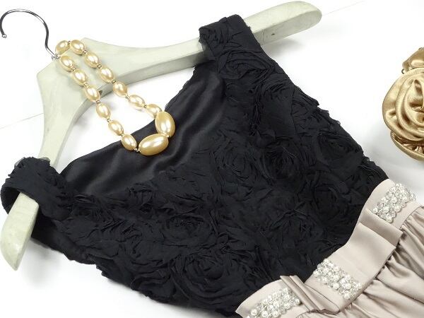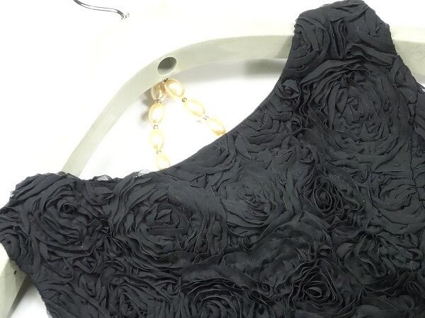 ウエストビジュー飾りのワンピ-ス。トップス部分は薔薇の花をイメージした立体モチーフを全体にあしらい、スカート部分は艶やかなシャンパンゴールドのサテン地を2重に重ねてデザインになっています。ウエストのベルトにはフェイクパールとビーズを配しアクセントに。ちょっとおしゃれな普段着として、またフォーマルなシーンでも活躍してくれる一着です。裏地有。右脇ファスナー。