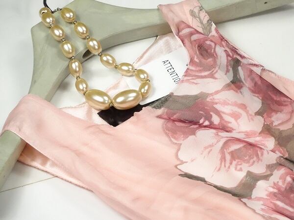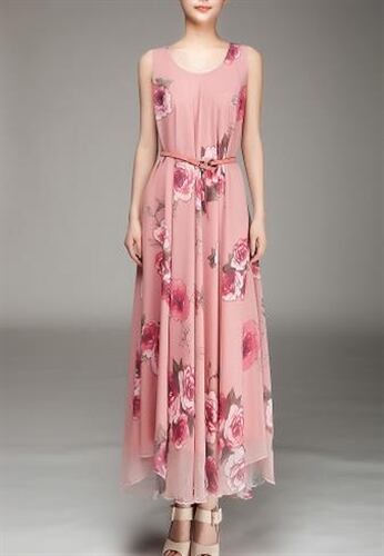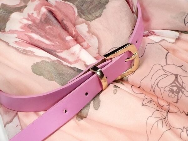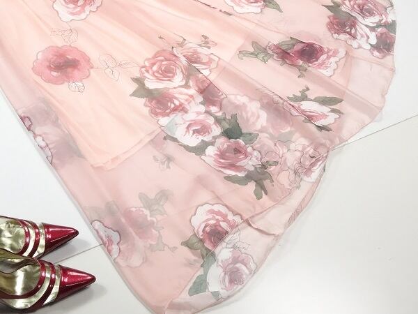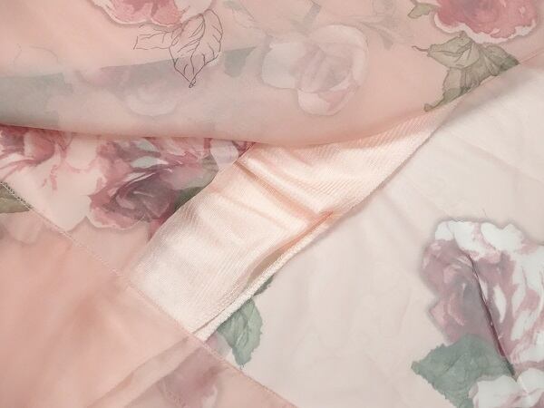 花柄プリントのシフォンワンピース。ラウンドネックから裾にかけて、たっぷりシフォンを使い、ゆったりとした印象のデザイン。ピンクの細ベルトがウエストをキュッと引き締めアクセントに。着心地抜群な素材でパーティーはもちろんちょっとしたお出かけにもお役に立つ一着です。ファスナーなしのかぶるタイプ。ベルト付。裏地あり。