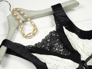 胸元レースのチュニックワンピース。胸元はV字カットでレースをあしらい、袖ぐりは黒の幅広パイピング。胸元からヒップにかけては、白のシフォン地に小さなドット柄がプリントされ、途中から花をモチーフとした模様がプリントされています。たっぷりとったシフォンがエレガントで優しい印象を与えてくれます。デート、お呼ばれ、パーティ、コンサート、結婚式にと、さまざまなシーンに活躍してくれる一着。ファスナーなしの被るタイプ。裏地あり。