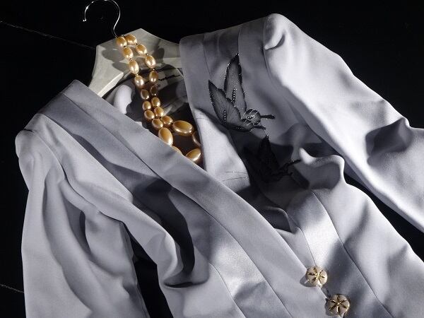 バタフライ刺繍が印象的なジャケットとスカートのセット。ジャケットは前3つボタン留めでエレガントな印象に。シンプルなラインのスカートとあわさり、品の良いシルエットに仕上がっています。ワンランク上の大人の装いを演出してくれる一着です。裏地あり。日本製。