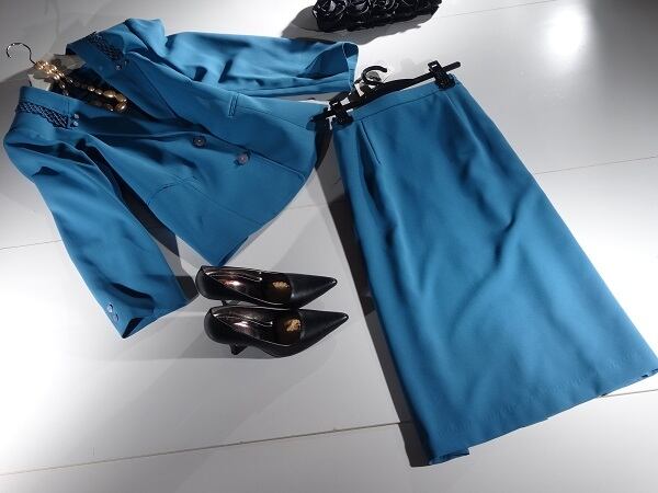 綺麗ブル-グリ-ンカラーのジャケットとスカートの上下セット。ジャケットの襟周りの刺繍がとても上品です。裏地有り。