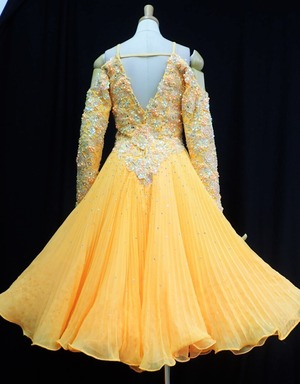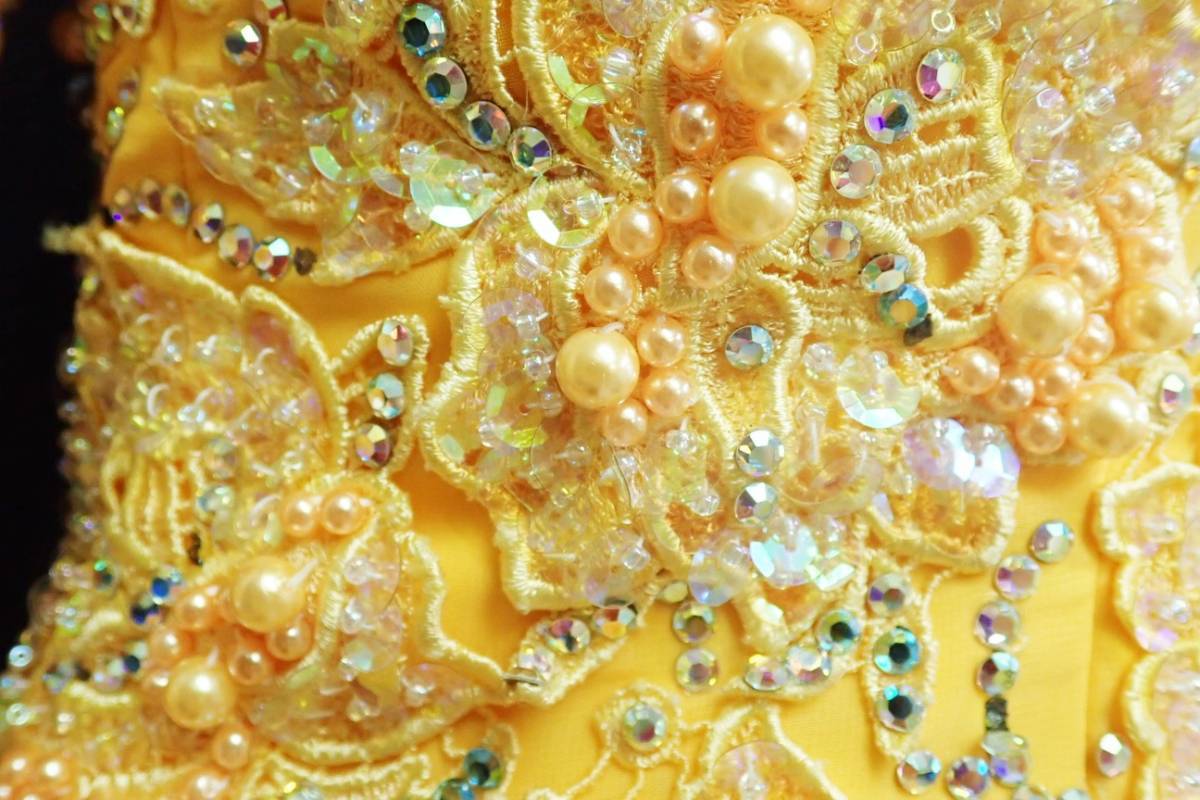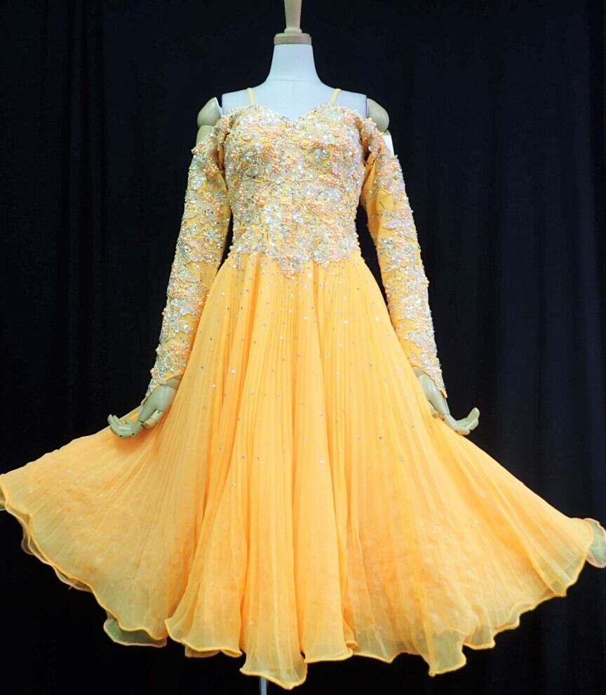 立体刺繍とビーズ飾りのプリーツドレス。上半身には立体刺繍とビーズ飾りを全体に配し、下半身はプリーツにスパンコールとビーズをあしらった豪華なデザイン。肩はオフショルダーにゴムの肩紐がついています。袖の部分には別にフロートがついており、そでにかけるタイプでドレスへの留め具はついておりません。ダンスに最適。パーティやイベント、結婚式など、様々なシーンで、気品のある印象を与えてくれる一枚です。飾りの分少し重くなっています。裏地付き。背中ファスナ-有。胸パットなしですがしっかりしているのでパッドなしでも大丈夫かと思います。