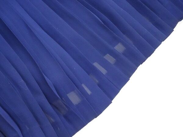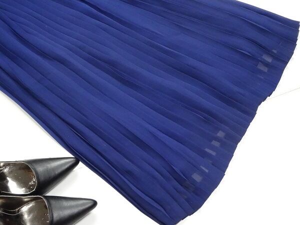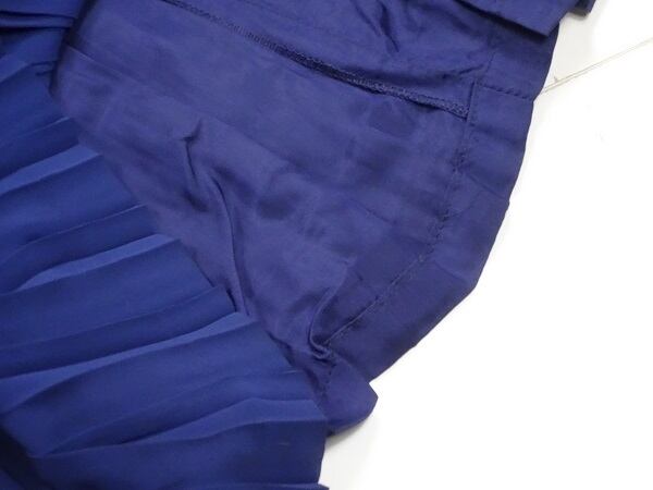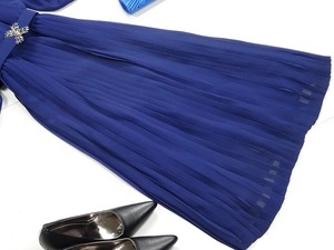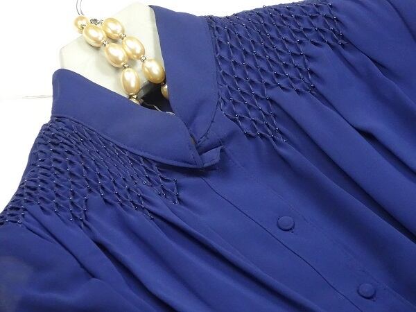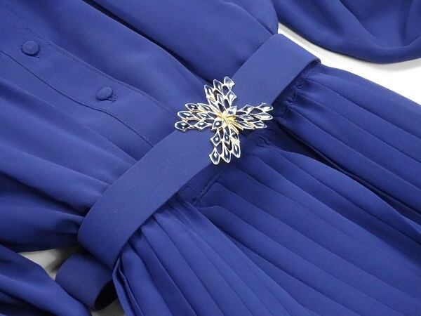 胸元シャーリング仕様ロング丈のワンピース。肩から胸元にかけて小さなビーズをあしらったシャーリング仕様が上品な印象を与えています。トップス前中央からウエストまでクルミボタン留め。ウエストはゴム仕様で伸縮性があり、裾までは約1.5cm幅のプリーツ仕様になっています。青のフックがついたベルトでキュッとベルトを引き締めてエレガントに。普段使いにも、フォーマルにも活躍してくれる一着です。ファスナーなし。前ボタン留め。裏地付。