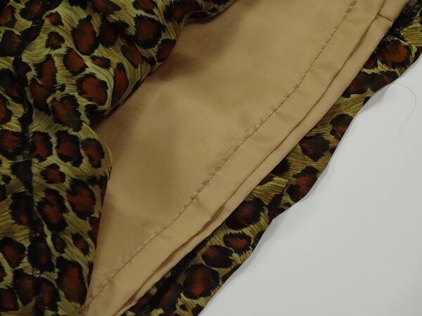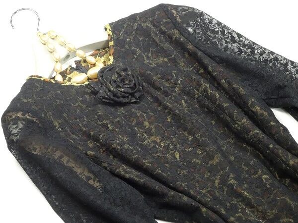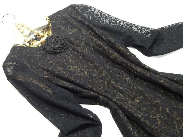 チュールとアニマル柄のロング丈のワンピース。アニマル柄の上に小花刺繍を施した黒のチュールレースを重ねた豪華なデザイン。下地全体にプリントされたアニマル柄を上地のチュールが抑え、華やかな中にもシックな印象を与えている一着です。肩パッド付。背中ファスナー。裏地あり。