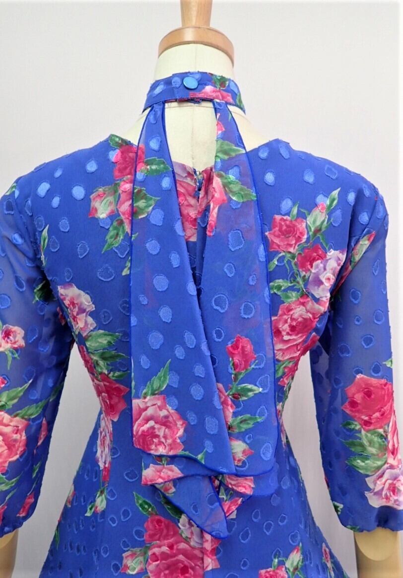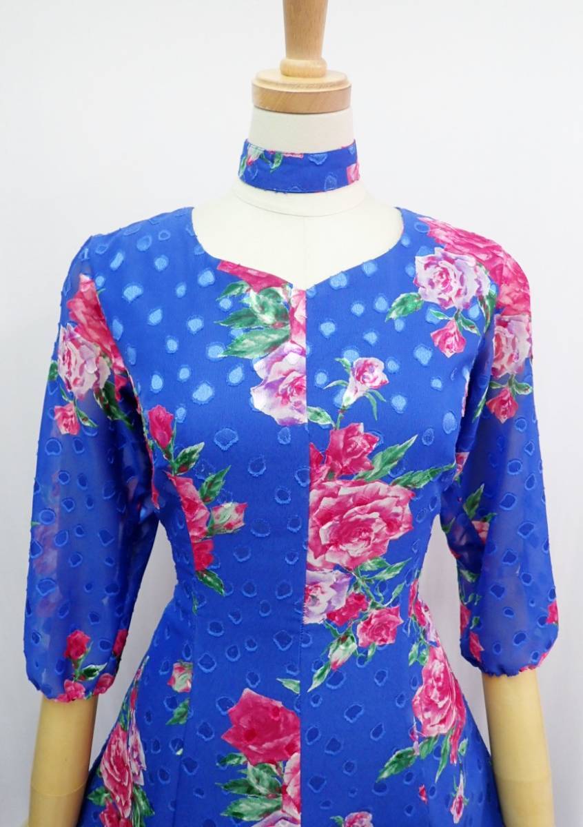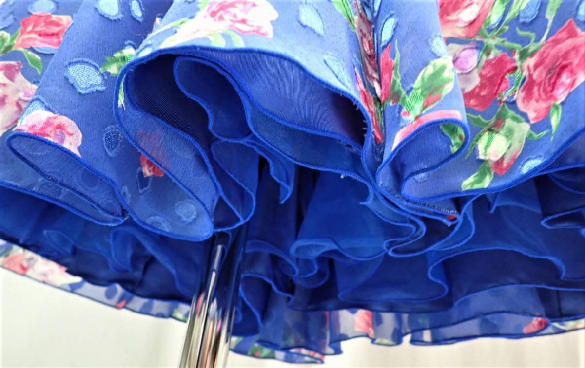 フレア-ミディアムドレスです。艶やかな青のサテン生地に薔薇がプリントされた柔らかい生地が重ねられたデザインです。スカ-ト部分の裾には、チュ-ルも重ねられ目を引くエレガントなドレスです。ダンスに最適です。裏地有。背中ファスナ-有。