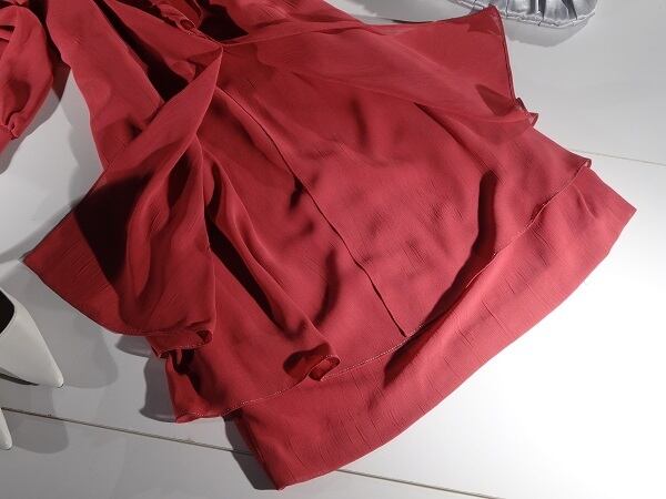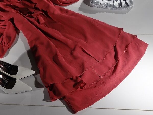 胸元のフリルがとてもお洒落で裾部分は3段の重ね着風になっていて上品で優しい大人の女性を表現してくれる一着です。 裏地有り。