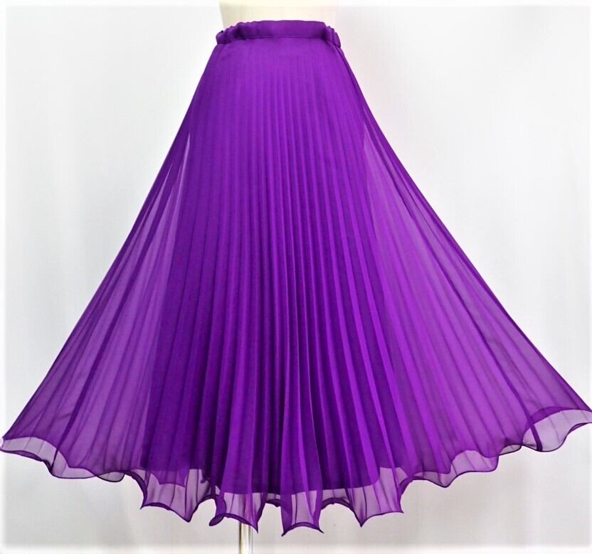 シフォンプリ-ツマキシ丈スカ-トです。プリ-ツがとても綺麗でシフォンが歩くたびにふんわりと揺れる魅力的なシルエット。ダンスにも最適です!ウエスト両サイド15cmゴム仕様で伸縮性あり。裏地付。