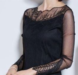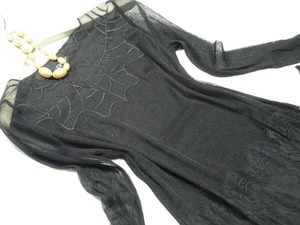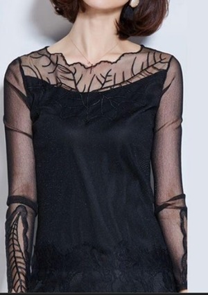 チュールのシックなワンピース。黒の下地の上に刺繍をほどこした黒のチュールを重ねています。デコルテラインから袖にかけての透け感がキュートなセクシー感を演出。大人の女性感が表現されたワンピ-スです。ファスナーなしのかぶるタイプ(生地に伸縮性あり)。裏地有。
