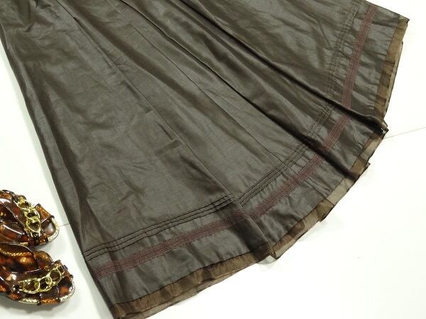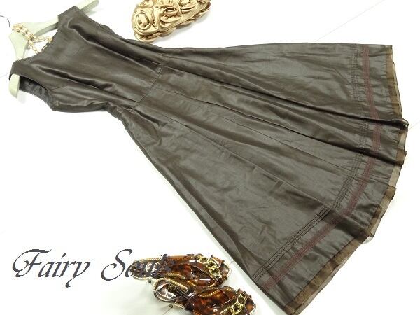 光沢素材とオーガンジーのワンピース。光沢のあるしっかりとした生地に、裾にオーガンジーを重ねたエレガントで優しい印象のデザイン。一見レザーの様に見えますが、ツイード風の織生地でハリがあります。デート、お呼ばれ、パーティ、コンサート、結婚式にと、さまざまなシーンに活躍してくれます。右サイドファスナー。裏地あり。