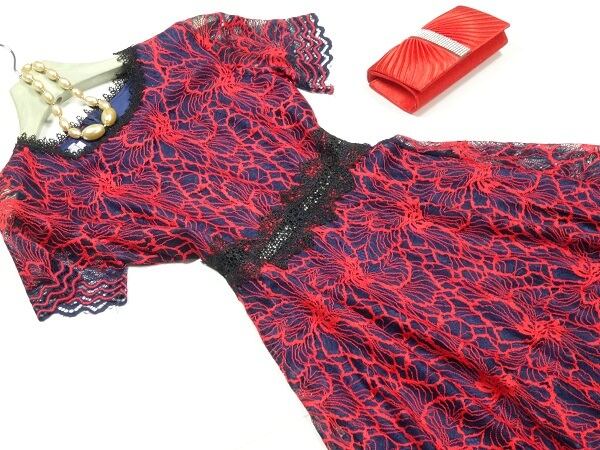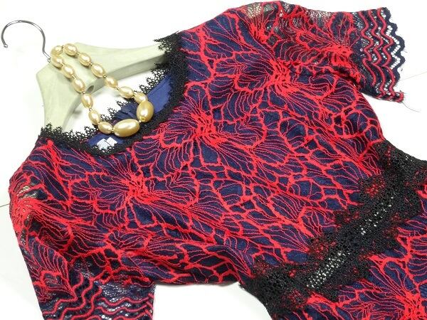 透け感が美しい総レース仕様のワンピース。濃いネイビーの下地の上に赤と黒のレースをかさねています。ウエストは下地がなくレースのみの仕様になっているのでほんのりと肌が見えるデザインになっており、品の良いセクシー感をかもしだしています。シックでやさしくエレガントな一着です。背中ファスナーあり。裏地付き。