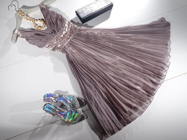 ビジュー飾りシルクプリーツのワンピース。V字デザインの胸元には中央に大きなフェイクストーンのビジュー飾りと、ウエストにはスパコールをあしらった華やかな一着。トップスはV字にそって縦に細かなタックをとり、ウエストから裾へかけてたっぷりとったシルクシフォンのプリーツがエレガントで優しい印象を与えてくれます。デート、お呼ばれ、パーティ、コンサート、結婚式にと、さまざまなシーンに活躍してくれます。背中ファスナー。裏地あり。