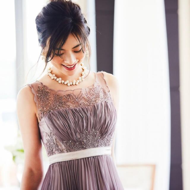 ビーズ飾りシルクプリーツのワンピース。胸元、ウエスト周りにビーズとスパコールをあしらった華やか一着。トップスは縦に細かなタックをとり、ウエストから裾へかけてたっぷりとったシルクシフォンのプリーツがエレガントで優しい印象を与えてくれます。デート、お呼ばれ、パーティ、コンサート、結婚式にと、さまざまなシーンに活躍してくれます。後ネックボタン1個留め。背中ファスナー。裏地あり。