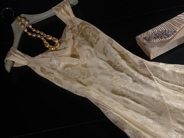 シャンパンゴ-ルドとローズの光沢が重なり上品かつエレガントなドレスです。裾はアシンメトリ-になっていてとてもセクシ-です。特別なシーンやパーティーい最適です。裏地あり。背中ファスナ-有。