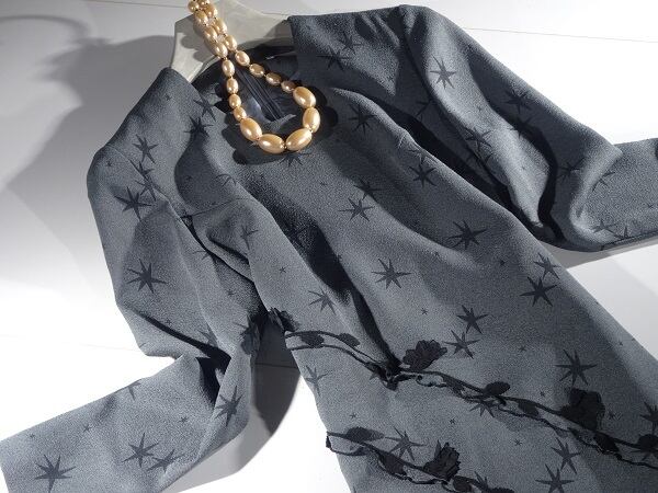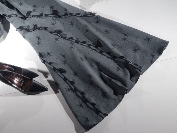 レトロデザインの豪華なワンピ-スです。腰から下の刺繍がアクセントなっています。パーティなどフォーマルなシーンにもぴったりな一着です。背中ファスナー。裏地有り。日本製。