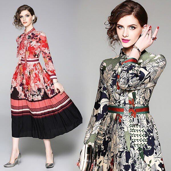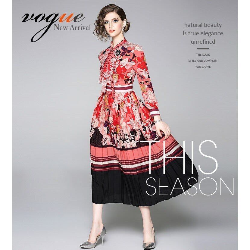 レトロテイストプリーツスカートのワンピース。艶やかな生地に落ち着いた色合いのレトロ柄をプリント。ウエストで切替、スカート部分はプリーツ仕様になっています。前ボタンと襟元のリボンがやさしい印象に。落ち着いた上品なテイスト。品の良い一着です。右脇下ファスナー有。裏地なし。