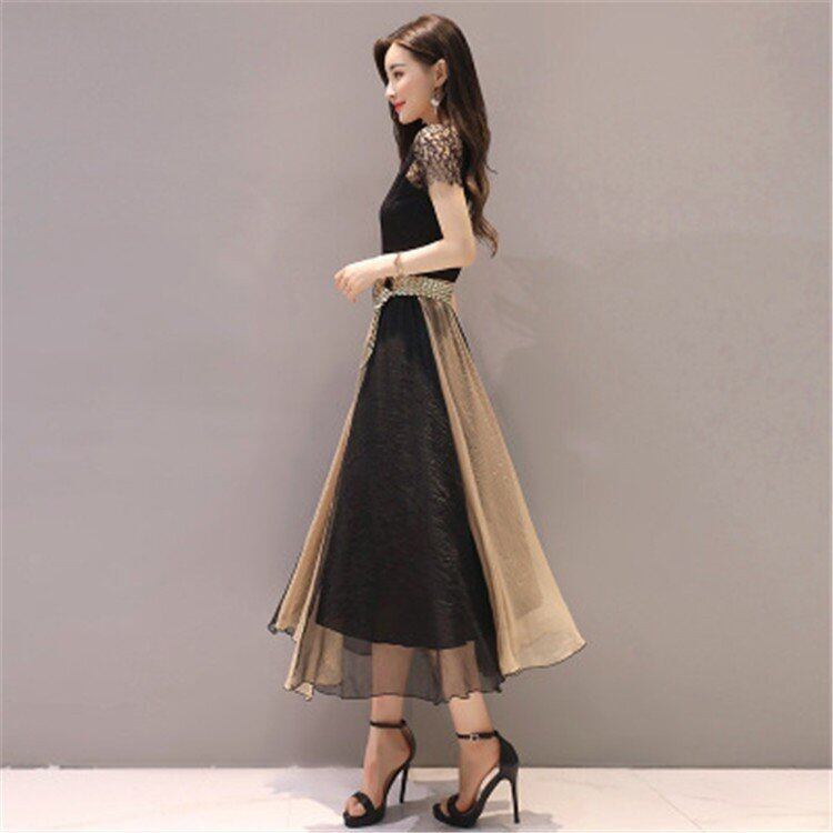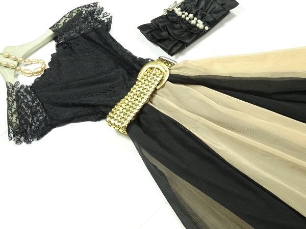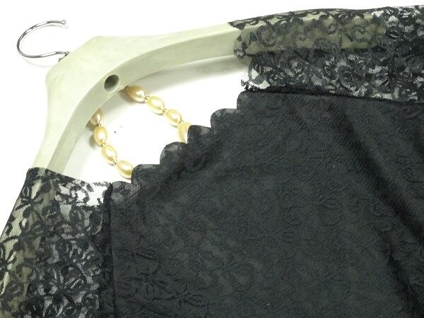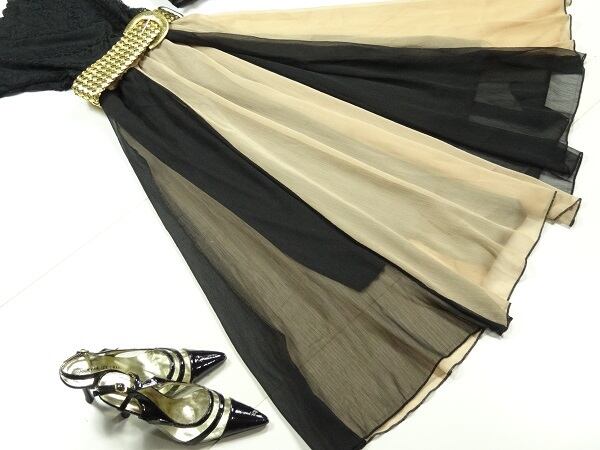 半袖透け感のあるレースとチュールのワンピース。トップスとオフショルダーの袖にかけてレース仕様し、ウエストのブラウンのチュールで切替。スカートは黒とブラウンのチュールを交互に6枚はいでゆったりとしたスタイルに仕上げています。動くたびに、しなやかで軽やかなチュール地が風に揺れ、フェミニンな印象を与えてくれます。バランスが良く、ピュアでフェアリー。煌めく太陽の光の中でも、また新緑の爽やかな風の中でも、着る人を美しく魅せてくれる一着です。裏地有。ファスナーなしのかぶるタイプ。ベルト付き。