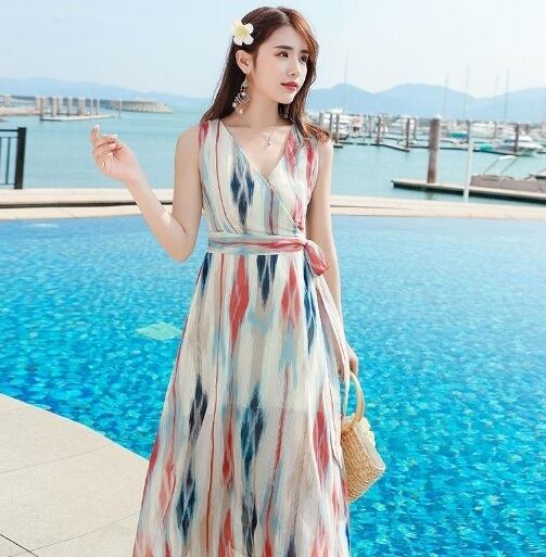 カシュクール風ノースリーブのワンピース。白地に不規則なストライプ柄を配し、襟はカシュクール風、ウエストは横に切り返しを入れることでアクセントを持たせた軽やかなデザイン。リゾート地以外でも、パーティやイベント、コンサートにと、さまざまシーンで活躍してくれる美しい一着。左脇ファスナー。裏地あり。