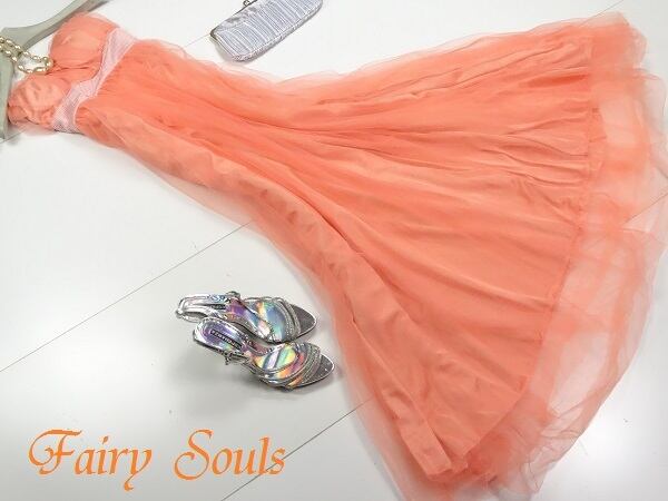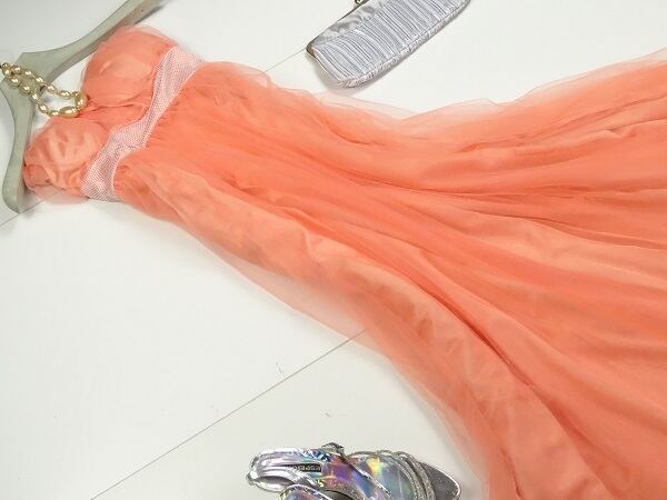 オレンジピンクの下地にレ-スを重ね合わせたとてもエレガントかつ女性らしいロングドレスです。。発表会や演奏会やステ-ジ衣装にお薦めです。裏地有。背中ファスナ-有。パット有。透け感なし。