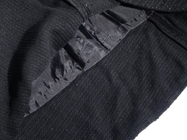 エレガントなrツイードジャケットとマキシ丈スカートのフォーマルなセットアップ。ジャケットはショート丈のフロントシングルボタン留め。マキシ丈のスカートは、ヒップから裾にかけてすこしつぼまったラインのマーメイドタイプ。裾は切替しで、シャープなストレートからやさしいフレアになってエレガントな印象に。黒のラメを編み込んだツイード地がフォーマル感をだし、裾の流れるフレアがしなやかさを醸し出す品の良い一着です。裏地あり。