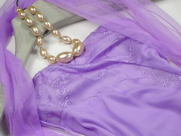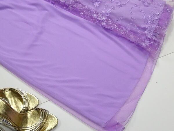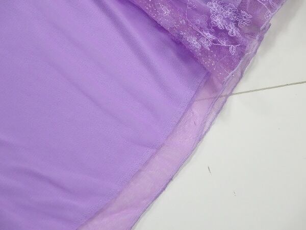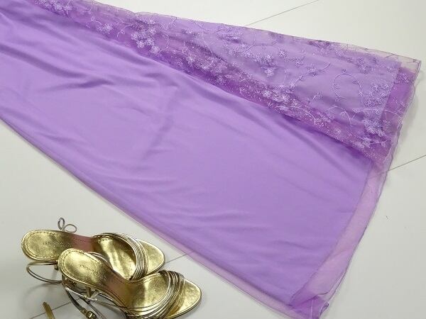 胸もとから裾にかけてレ-スになっていてとてのエレガントかつ女性らしいドレスです。レース部分のラメと刺繍がとても素敵です。パーティや結婚式、コンサートなど、様々なシーンで活躍してくれる一着です。ファスナーなし。背中ファスナ-有。裏地有り。スト-ル付き。
