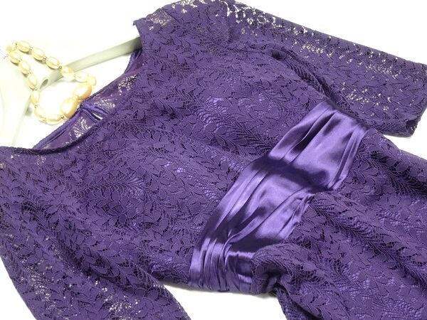 半袖総レース仕様ロングドレス。シックな紫のレース地に花柄を配し、エレガントで品の良い印象に。背中側は首元がフック留め。その下から背中の中央辺りまでスリットが入り、そこからウエストに向けてファスナーがついています。ウエストのサテン地が艶やかで、品の良いシックでエレガントな一着です。背中ファスナーあり。裏地あり。胸パッド付。