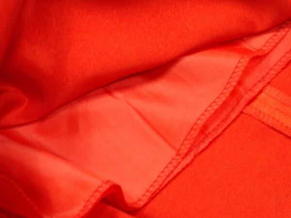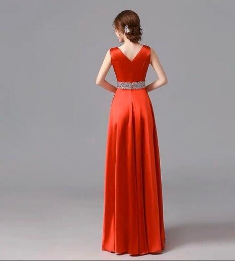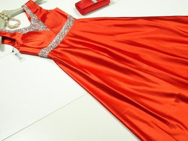 スパンコールとサテンのロングドレス。鮮やかな朱色のサテン地に、肩から胸元、ウエストに