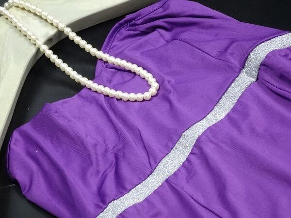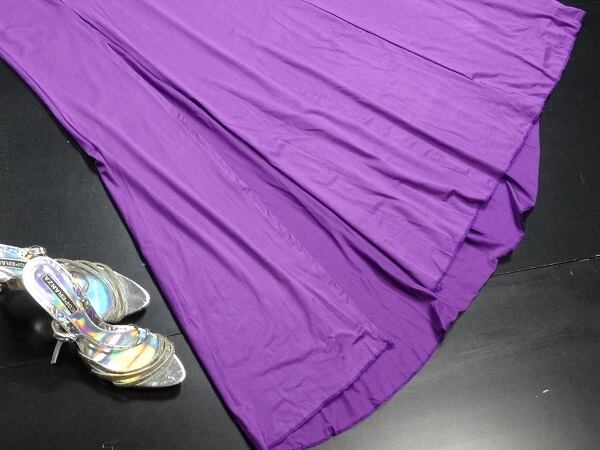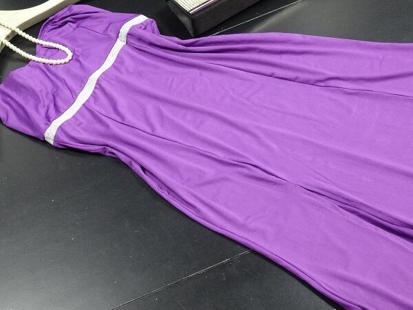ベアタイプジャージ素材のパ-ティ-ドレス。右サイドには太ももからすそにかけて大きなスリットを入れ、胸元は胸の形に沿ったセクシーなフォルム。ウエストにはシルバーのラメ地をアクセントに配しています。やわらかな紫のジャージ素材なので伸縮性があり動きやすいデザインになっています。パーティやイベントなど、様々なシーンで、魅力的な印象を与えてくれる一枚です。裏地なし。ファスナーなしのかぶるタイプ。右サイドのスリットは裾から上に約68cm位。ベアタイプですが、透明な肩ひも付きでずり落ちる心配はありません。胸パッドは付いていません。