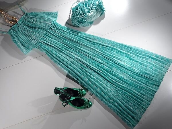 薄手のポリエステルプリ-ツ加工生地でしわにならないリゾ-ト調ロングドレスです。結婚式やパ-ティ-で大活躍すること間違いなしの一品です。裏地あり。インナ-付き。