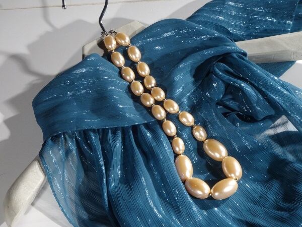 トップスはスカ-フタイプのホルダ-ネック。長さも十分ありますのでボリュウムあるリボンが結べます。裏地は、シルバ-メタリックのカットソ-がベアトップ風に縫い付けてあります。スカ-トは、ウエストゴムで幅14cmありハイウエストタイプです。三段ティア-ドタイプです。裏地有。