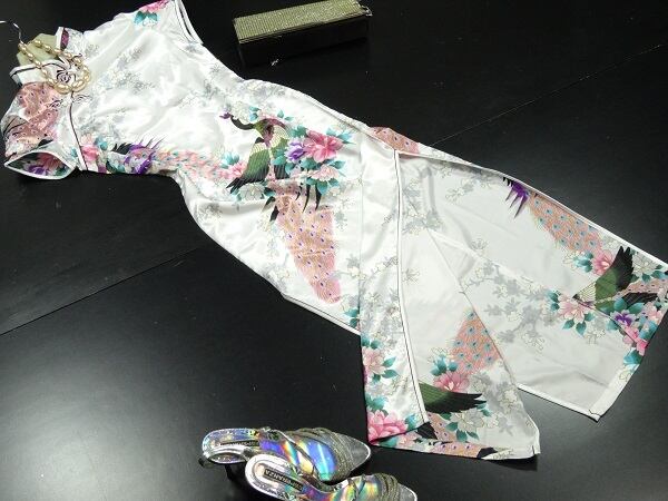 花柄ロングチャイナドレス。白のサテン地に淡い花柄をプリント。とても上品でスリムな大人の女性を醸し出してくれる一着です。裏地なし。背中ファスナ-有。両サイド51.5cmのスリット有。