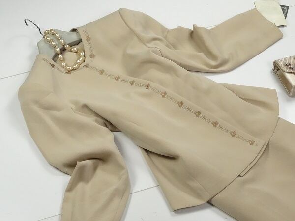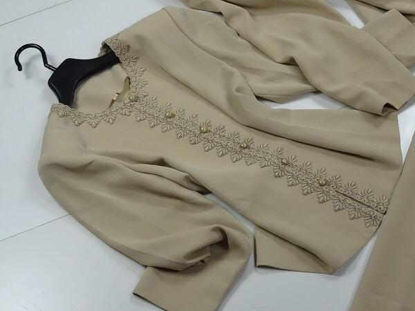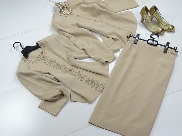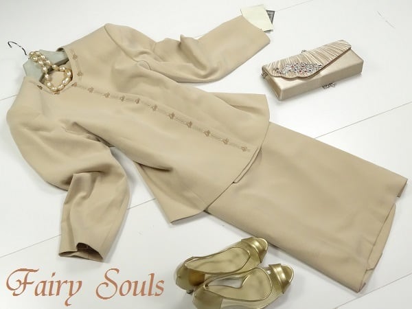 胸元から腰までの刺繍とが印象的なジャケットとスカートとトップスの3点セット。ジャケットはエレガントな印象に。シンプルなラインのスカートとあわさり、品の良いシルエットに仕上がっています。ワンランク上の大人の装いを演出してくれる一着です。後ろファスナー。裏地あり。日本製。