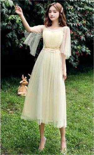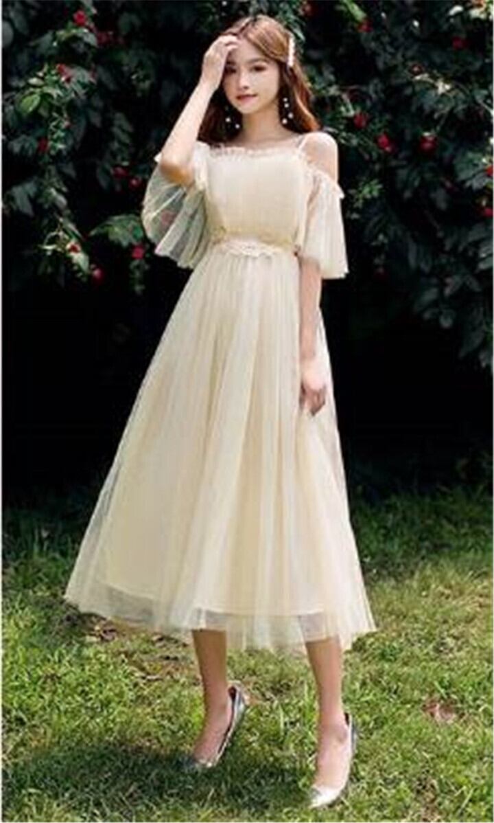 チュール袖フリルミディアムドレスです。淡いクリーム地の上に同色のチュールを重ねて豪華な雰囲気に。袖は肩からたっぷりとチュールを使用した広がるデザインで動きやすくなっています。パーティやイベント、結婚式など、様々なシーンで、気品のある印象を与えてくれる一枚です。裏地有。右脇ファスナ-有。胸パット付。