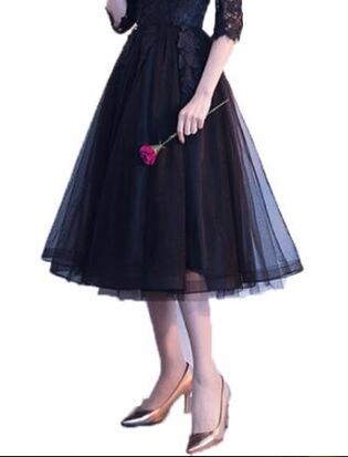 チュールとレースのシックなドレ。黒のサテン地の上にチュールをかぶせ、上半身と袖はレース仕様になっています。シックで品があり華やかな、コンサート、ライブ、結婚式の二次会、パーティにとどんなシーンにも活躍してくれる一着です。裏地あり。背中ファスナ-有。胸パット付き。ウエストはゴム仕様ではないため伸縮性はありません。