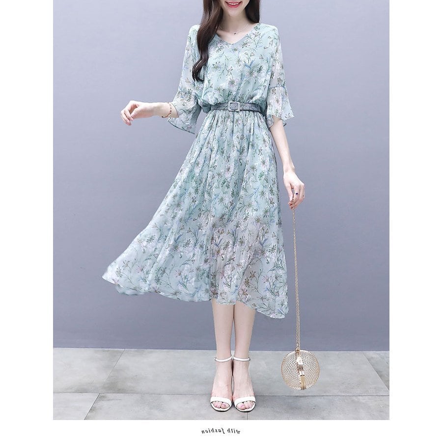 プリ-ツ加工のひざ丈ベルト付ワンピース。やわらかなペパーミントグリーンのシフォン地に花柄をプリント。スカート部分は細かなプリーツ加工がされていて動きやすく、袖はシフォン地をたっぷりと使用してふんわりとしたデザインになっています。ウエストは総ゴムなので長時間着ていても楽です。爽やかなペパーミントグリーンが心を軽やかに華やかせてくれます。裏地付。ファスナーなしのかぶるタイプ。ベルト付き。