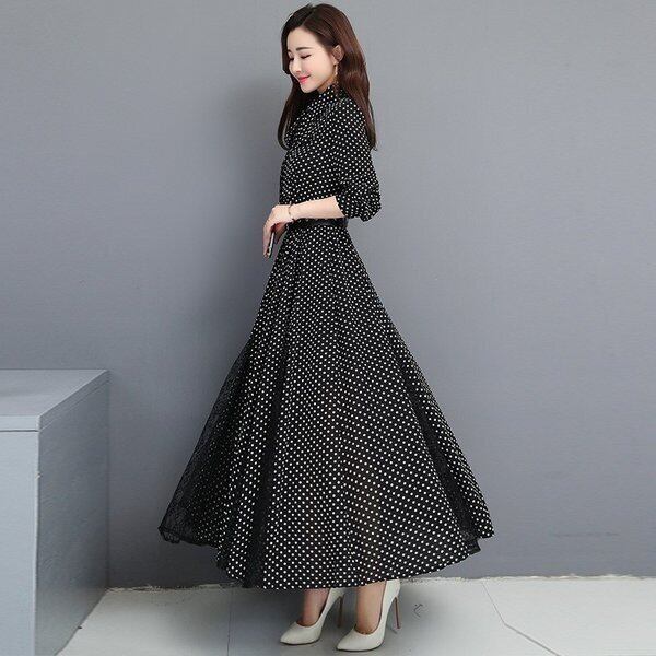水玉前ボタンレース合わせのワンピース。やわらかな黒地に水玉模様がキュート。上半身はきっちりとした襟と前ボタンがフォーマル感を演出。スカート部分は水玉地とレース地を交互に合わせたユニークなデザイン。ウエストのベルトがアクセントになっています。イベントや結婚式の二次会などフォーマルなシーンにも最適。重宝する一枚です。裏地なし。前ボタン留め。ベルト付き。