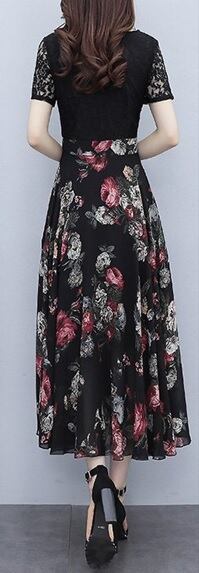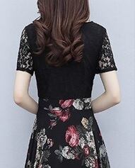 ボタニカル柄半袖レースのワンピ-ス。シックな黒地に大きなボタニカル柄をプリントした半袖タイプ。上半身と袖はレース仕様。スカート部分はふんわりとしたシフォン地で、動くたびに裾が風になびきかろやかな印象に。裏地有り。右脇下ファスナ-有。
