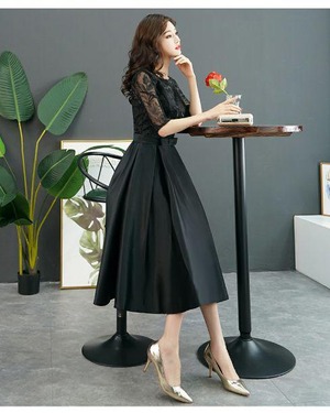 エレガントパ-ティ-ワンピ-スです。気品に満ちたとてもエレガントで上品なひとクラス上をいく一品です。トップス部分のレースがとても上品でエレガントです。裏地有。背中ファスナ-有。胸パット付き。