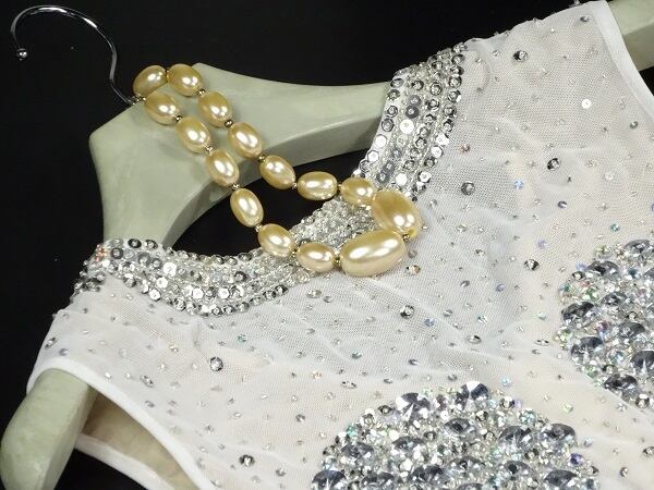 スパンコールが施されたロング丈フレア-スカートドレスです。胸元のビジューとスパンコールが、踊りに合わせて光にきらめき、優雅でゴージャスな印象に。バックは深いV字襟になっていてセクシーな印象に。ネット仕様で伸縮性有。背中ファスナー。裏地有り。