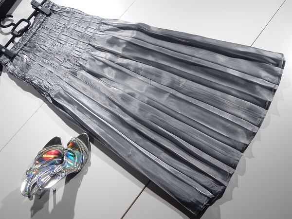落ちついたグレーの艶やかなブラストとロング丈のスカートのセットアップ。ブラウスは浅い立ち襟に前ボタン留めの長袖タイプ。胸元と袖に縦の細いプリーツが施されています。ウエストを少し絞り、裾にかけて広がりを持たせており、エレガントなラインに。スカートはウエスト総ゴム仕様でサイズにゆとりがあり、ヒップの上あたりまでブラウスと同じプリーツになっています。ヒップから裾にかけては5cm幅くらいの箱プリーツ。サテンのように艶やかなメタリックグレー。薄く羽毛のような軽やかさがあります。裏地あり。