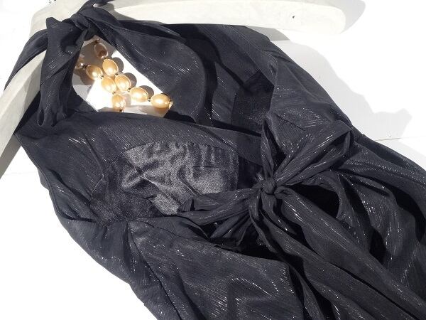 黒のラメ入りホルターネックのロングドレス。カシュクール風のバストラインは胸パッド入り。ハイウエストは少しくびれを持たせ、裾にかけてスレンダーに広がるラインが女性らしいシルエットを醸し出しています。バストから上に向けて幅広のホルターネックリボンが伸び、首の後ろで結びます。背中部分は左右を細いゴムベルトとフックで結ぶデザインになっているのでずり落ちる心配もありません。細いラメのラインがシックな黒に映えて魅力的な一着になっています。裏地付。