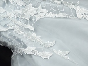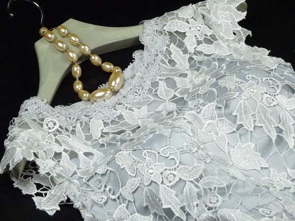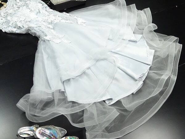 フィッシュテ-ル立体刺繍のミディアムドレス。シルバーグレーのサテン地の上にチュールをかぶせ、トップス部分には立体刺繍をほどこした後ろの裾が長いフィッシュテール型のキュートでフェミニンなデザイン。パーティやイベント、コンサート、結婚式にと、さまざまシーンで活躍してくれる美しい一着。背中ファスナー。裏地付。胸パッド付。