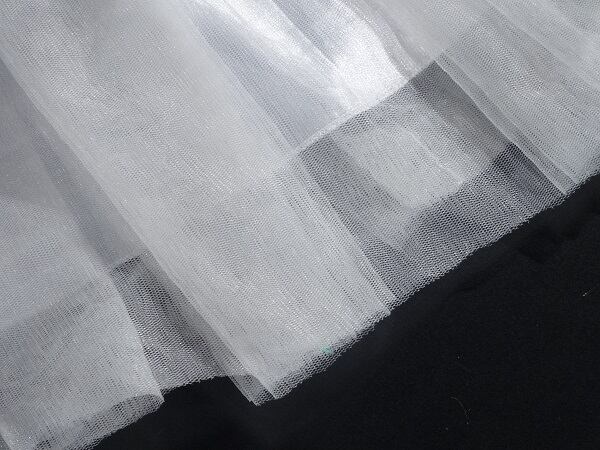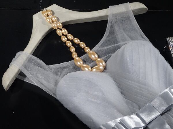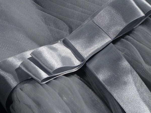 落ちついたシルバーグレーのミニドレス。トップスは細いタックが斜めに入り、ウエストから裾にかけてタックがふんわりとしたフレアに変わっていきます。肩ストラップはありませんが、背中が紐の編み上げになっているので、体にフィット。チュールをたっぷりと使用し、キュートの中にも豪華な印象を与えてくれる一着です。バックファスナ-有。裏地有り。
