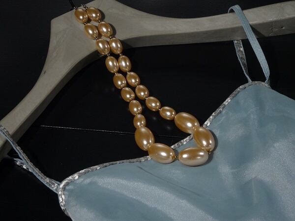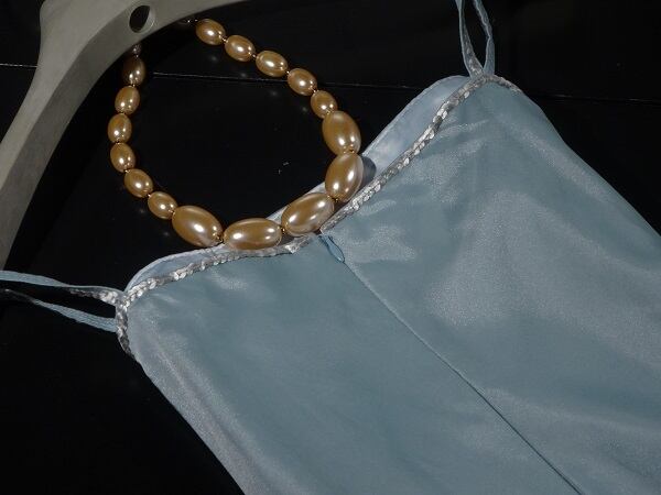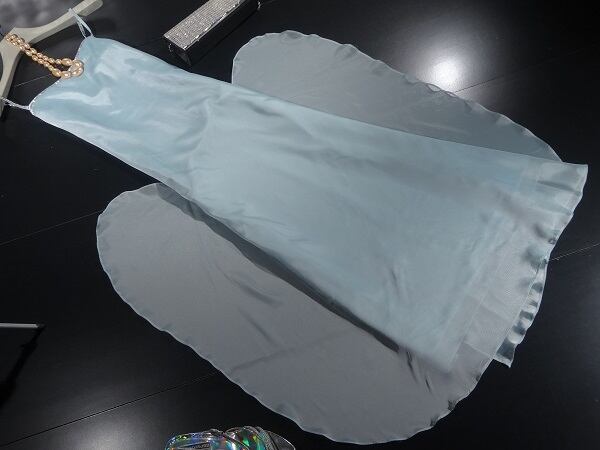 しなやかなオーガンジーのロングドレス。胸元とストラップにスパンコールをあしらった華やかなデザイン。ウエストから裾にかけては、裏地と合わせて生地を3枚合わせた構造になっており、風にひらめいて妖精のよう。バックファスナ-でホック留め。裏地有り。