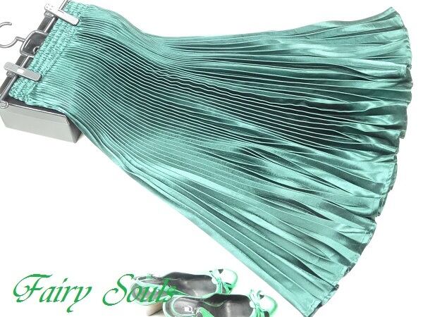 光沢メタリックグリ-ンロングプリ-ツスカ-トです。しわになりにくく動くたびに揺れるエレガントなプリ-ツスカ-トです。ファスナ-なし(ウエストゴム仕様)。裏地なし。