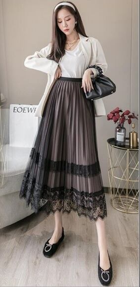 ネットチュールのリバ-シブルロングスカ-ト。ブラウンの下地に黒のチュール地をふんだんに使用。裾は山形にカットし花模様をあしらった魅力的な一着。ウエストゴム仕様。ファスナ-なし。裏地付。3番の色です。