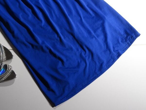 深い光沢のある青のロングドレス。胸元はカシュクールタイプでゆったりとしたドレープ仕様になっています。肩は幅を広くし、着用時、肩から胸のラインが美しく見えるように。伸縮性のあるジャージ素材なので、サイズ的にもゆとりがあります。シンプルで上品なデザイン。パーティ、イベント、結婚式の二次会、コンサートなど幅広いシーンで活躍してくれる一着です。胸カップなし。ファスナーなしの被るタイプ。裏地なし。