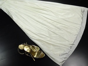 トップスに花飾りのモチーフをあしらったオフホワイトのロング丈のドレス。左肩紐はシンプルに、右肩紐にはフリルがあしらわれ、左右で異なるユニークなデザイン。右胸と左ウエスト部分の大きな共布の花モチーフがアクセントになっています。幅広のウエストで全体を引き締め、裾にかけてたっぷりとした生地でしなやかさを演出。伸縮性のある生地なので、長時間でも楽に着用頂けます。パーティ、イベント、結婚式の二次会、コンサートなど幅広いシーンで活躍してくれる一着です。肩紐調整不可。胸カップ仕様。背中ファスナー。裏地あり。