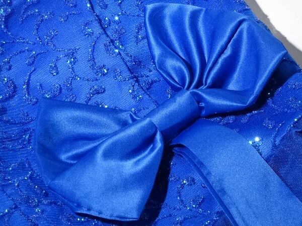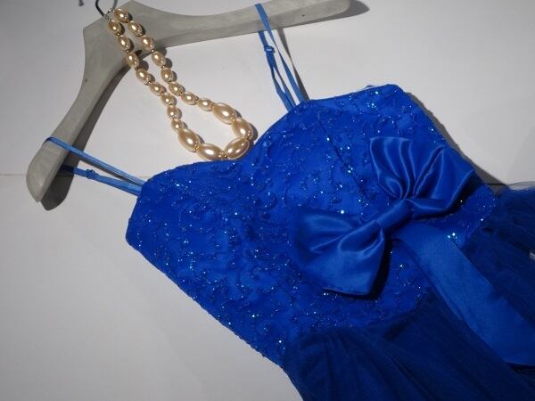 深い青のチュールキャミソールドレス。胸元にはネットチュールの上に小さなビーズをあしらい、左ウエスト部分には大きなサテンのリボンをあしらいました。裾にかけてやわらかなジャージ素材の上にチュールをたっぷりと使い、ぼりゅーむのあるゴージャスなデザインになっています。パーティ、イベント、結婚式の二次会、コンサートなど幅広いシーンで活躍してくれる一着です。表記は「L」ですが、サイズ的には9号(M)くらいかと思います。肩紐調整可能。胸カップ仕様。背中ファスナー。裏地あり。